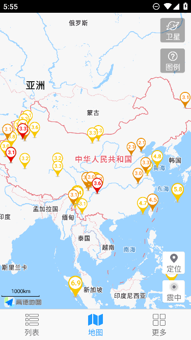 3、地震列表上的所有地震可以定位到地图上,震级大小和发震时刻通过标注符号区分;