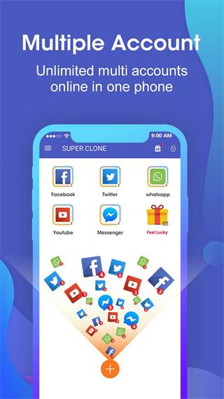 Super Clone超级多开是一款免费无限多开软件,该软件功能是非常强大的,该软件所支持多开的数量是没有什么限制的,不管是游戏、社交软件都是可以进行克隆的,小伙伴们还可以自由设定图标方便分辨识别各个分开软件,也是非常安全的,有需要的小伙伴们快来下载Super Clone超级多开体验吧!