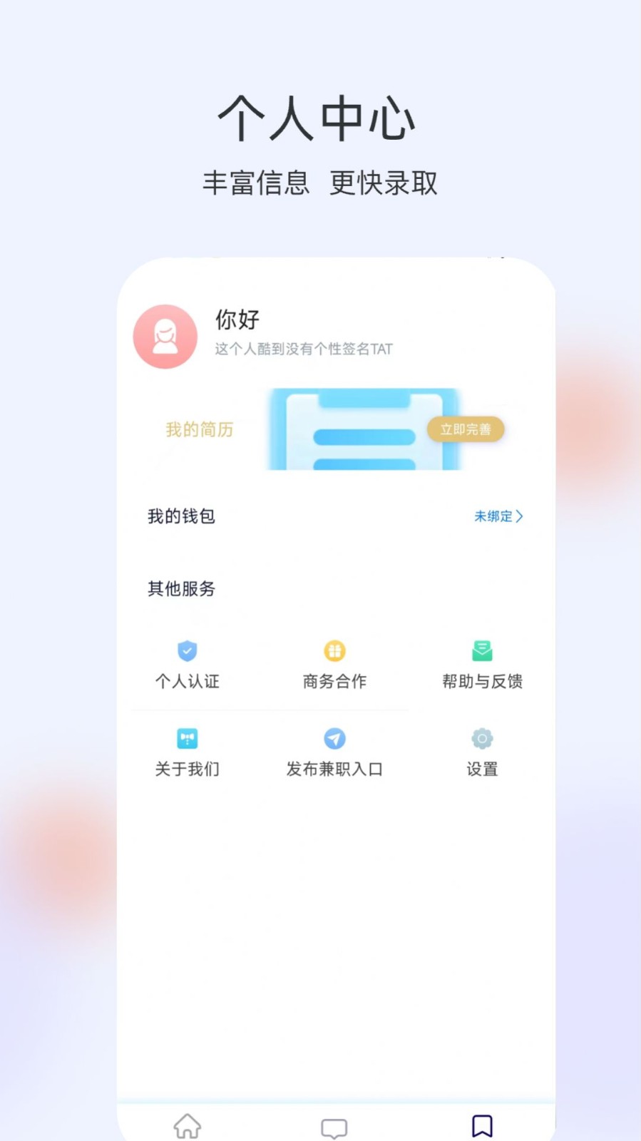 2、提供全职、短期、兼职、临时等多种工作类型,并且还为用户提供了接单、跑腿、家教等委托服务,满足用户不同的求职需求;