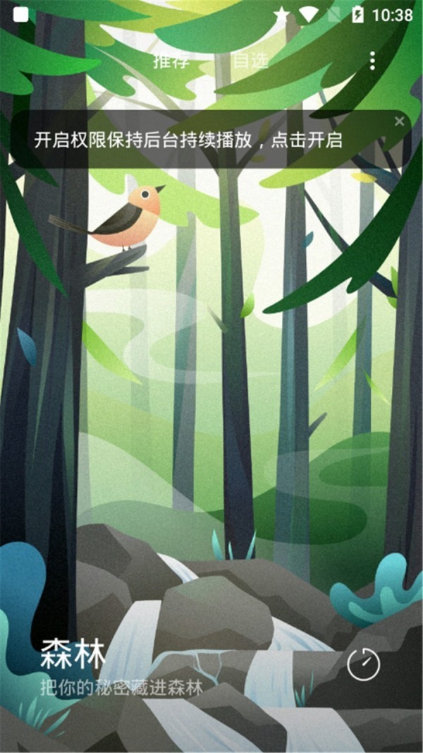 1、可以挑选流动的溪水,雨声,雷声,风声等不同的声音,让用户的内心能变得平静下来。