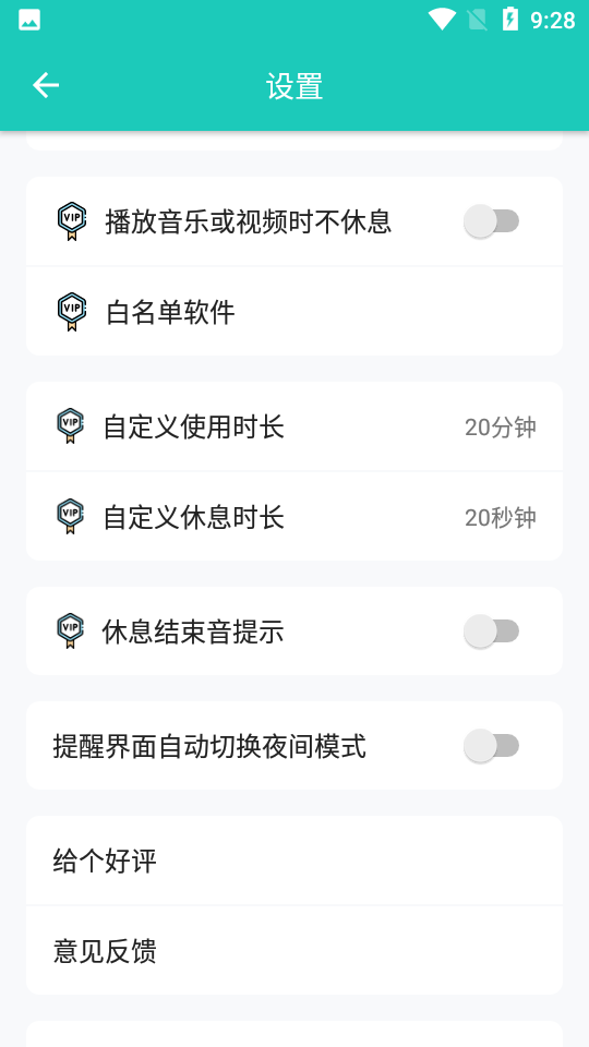 2、强制休息:您可以设置强制休息,以防自己由于忍受不住关闭护眼或不按时间休息。