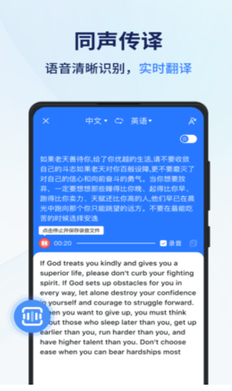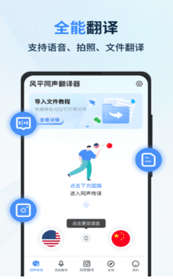 同声传译王app是一款多功能的翻译软件,该软件品内置了高智能翻译模块,具备同声传译、拍照翻译、口语陪练、语音翻译、文档翻译、音频翻译和视频翻译等功能,翻译准确率高,处理速度快。同时产品还包含了多种办公小工具以及还能通过拍照、文件和视频的方式分别进行翻译,是一款简单易用的翻译app。