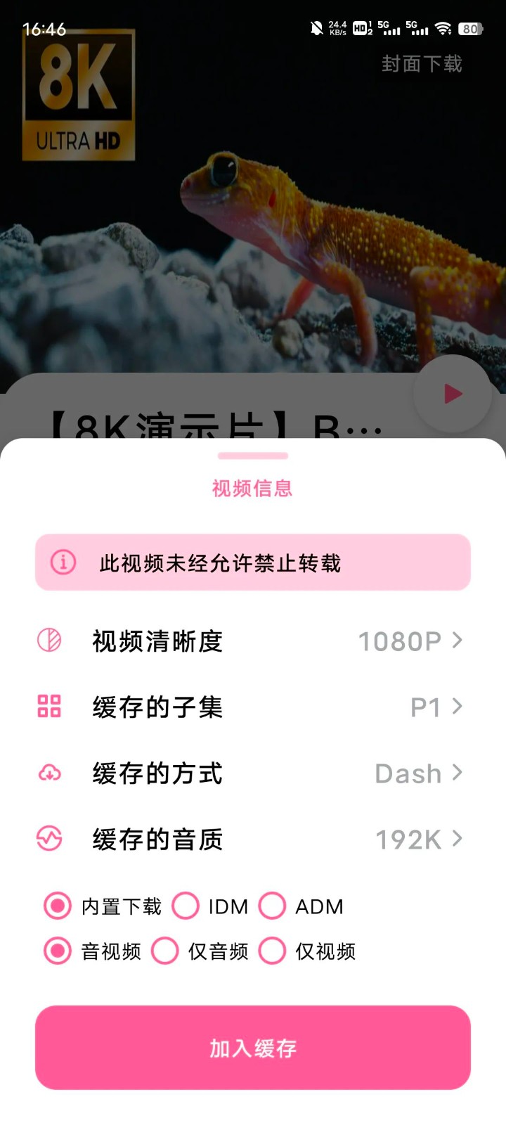 3、点击解析出来的视频,选择缓存视频,就能自由选择视频清晰度,音质等选项。选择完毕后,点击“加入缓存”就能完成下载。