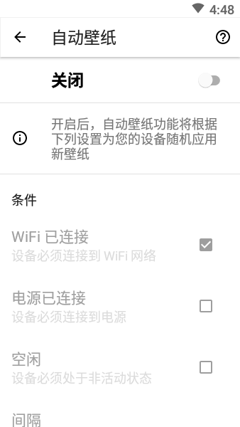 4、对于图片壁纸更新问题,在左下方菜单栏--自动壁纸中,先开启该功能,WIFI连接勾选,之后大家就可以根据“时间间隔”来进行设置了,短到15分组,长到一天、一周和一个月,都可以。