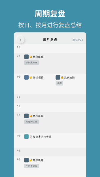 3、周期复盘:该功能允许用户回顾过去一段时间内的习惯记录,并进行总结和反思。用户可以分析自己在某个周期内的表现和挑战,从而更好地调整和优化自己的习惯养成计划。