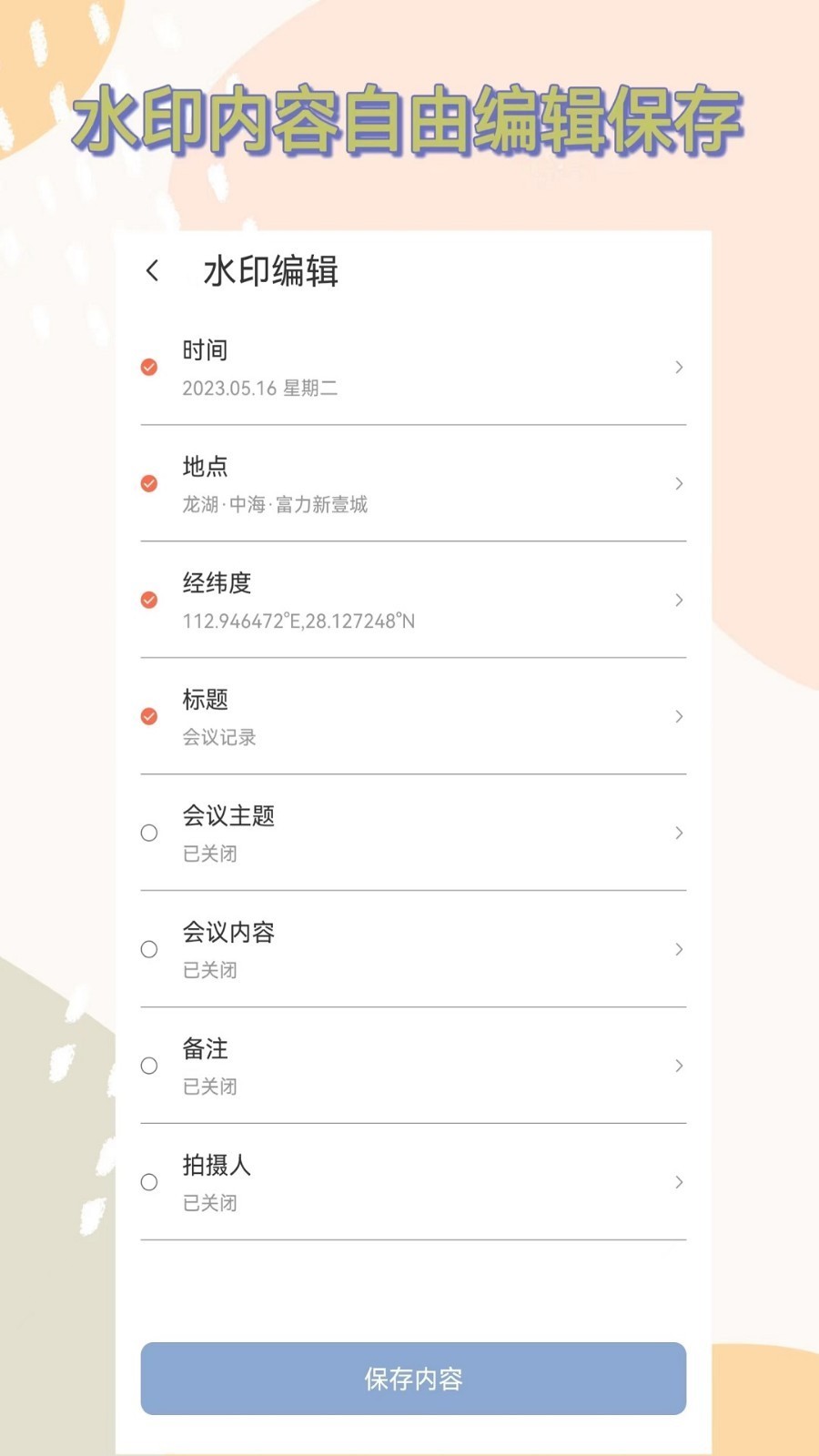 水印可自动更新为实时的日期、地点、天气等信息,经纬度、海拔、速度、分贝也能记录。
