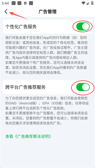 6、将亮相服务关闭,随后点击屏幕左上角的“返回”标识。