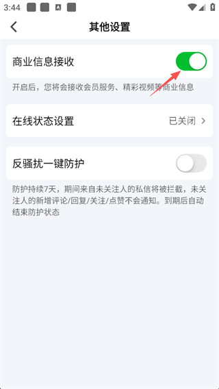 8、点击屏幕上方“商业信息接收”右侧的“开关键”关闭。
