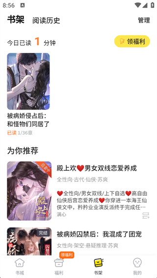 4、智能书架,添加到书架之中的连载中的小说,章节更新的第一时间来提醒。