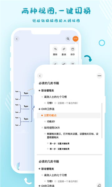 充满活力的UI界面让你快速上手制作思维导图,手指轻触可变换思维导图的样式和结构,支持制作树状图、结构图、架构图和鱼骨图等常见思维导图。