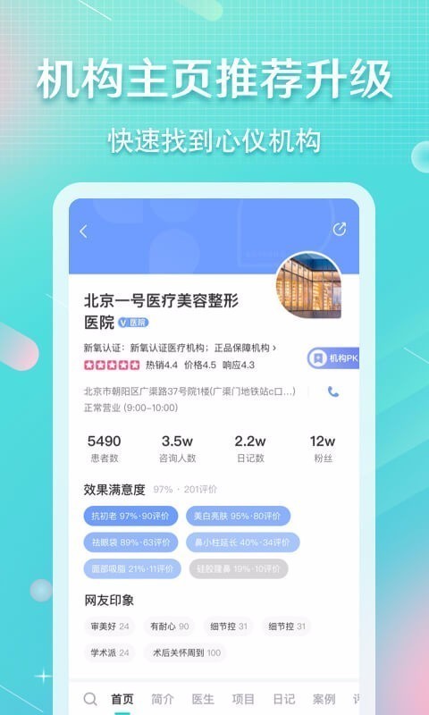 2、权威医生:目前有超过1万名经过资质认证的医生在线,超过6千家正规医美机构入驻,为用户提供专业客观的诊断建议。