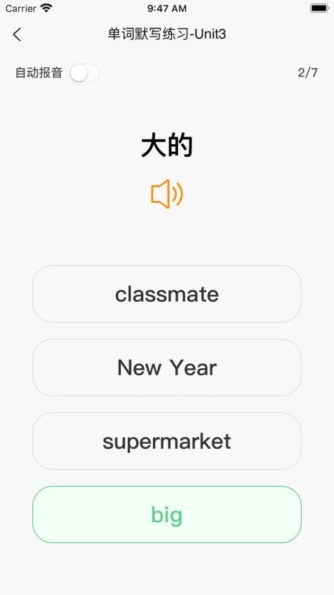 1、智能语音默写: AI技术播报单词,模拟真人发音,提升听力理解能力。