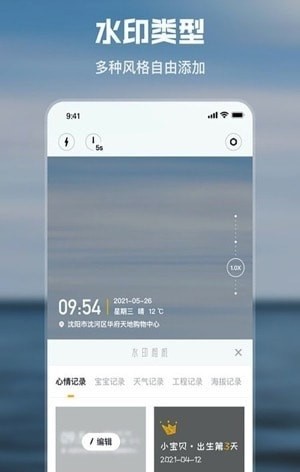 提供丰富的水印类型,包括时间地点水印,能够智能地获取您的当前位置和时间,使得您在工作、旅行、生活中都能轻松拍照并留下准确的信息记录。