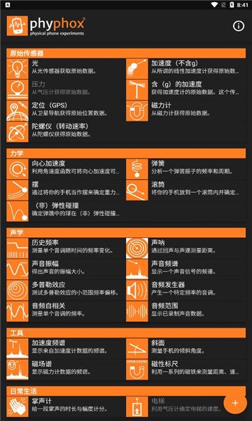 phyphox软件又叫手机物理工坊,是一款专业物理实验辅助工具,将您的手机打造成一款移动实验室,内置功能是非常全面的,传感器、数据导出、远程控制、以及自定义实验室等等,不管是用来记录你的实验数据、结果还是用来日常学习都是非常不错的选择,有需要的小伙伴们快来下载phyphox体验吧!