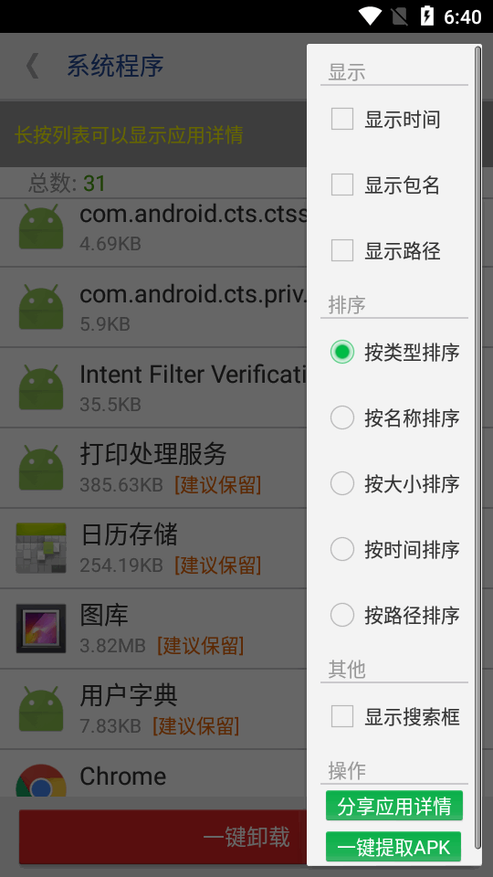 4、也可以点击右上角的按钮、进行多项操作、比如一键提取apk、分型应用详情、显示时间包名路径等等;