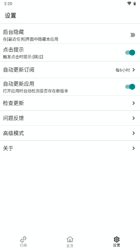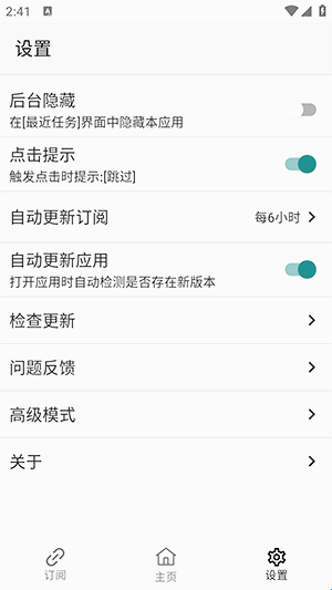 6、点击右下角【设置】按钮,可设置后台隐藏、自动更新订阅、自动更新应用、高级模式等
