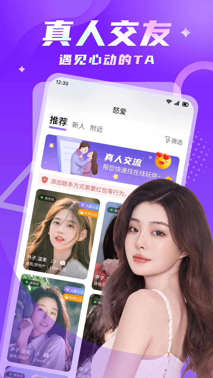 怒爱交友app是一款非常受大家喜欢的同城在线聊天约会软件,拥有独一无二的AI智能推荐算法,精准匹配你的兴趣和喜好,提高用户社交的成功率。还为用户提供丰富的社交活动,组织精彩独特的线下聚会,助你拓展人脉圈子,感兴趣的朋友快来下载试试看吧!