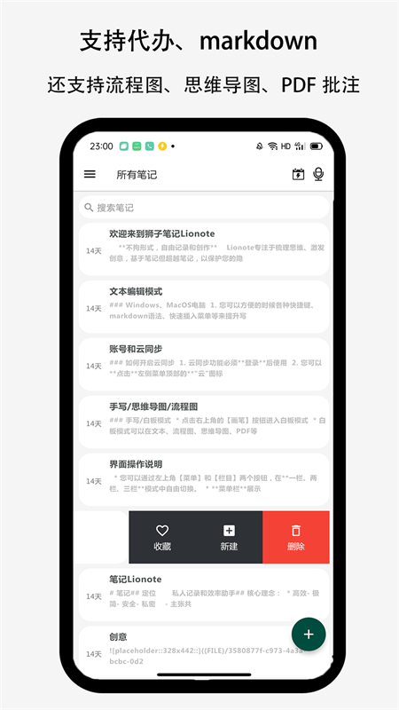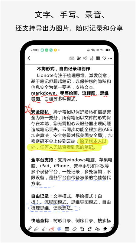 LionoteAPP是一款专业的笔记记录软件,软件中提供了齐全的笔记工具,适用于各种各样的场景,比如演讲演示、工作日志、生活日记、学习笔记、备忘录、工作待办等多种场景中都可以随意使用各种工具完成,让用户运用便捷的笔记工具轻松记录各个场景中需要运用的信息,方便用户对相关的信息内容进行回顾并使用,为用户记录各种笔记内容提高效率以及减轻压力