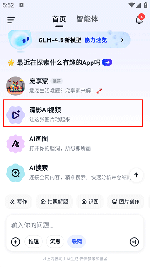 智谱清言是一款非常好用的手机智能AI助手软件,功能丰富强大,不仅可以通过虚拟对话来回答并解决用户的各种问题,软件涵盖多个领域,为你提供高效实用的沟通体验,在这里你可以获取超多灵感和高质量文案等,不断提升你的写作效率和质量,喜欢这款软件的小伙伴们快来下载试试吧!