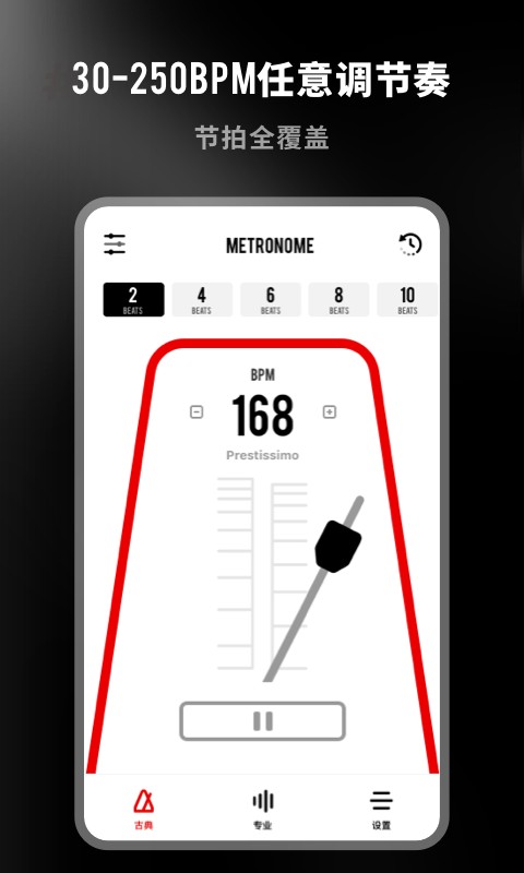 古典和专业2种模式,摆针和数码表盘2种界面,让你感受不同风格的节拍器魅力