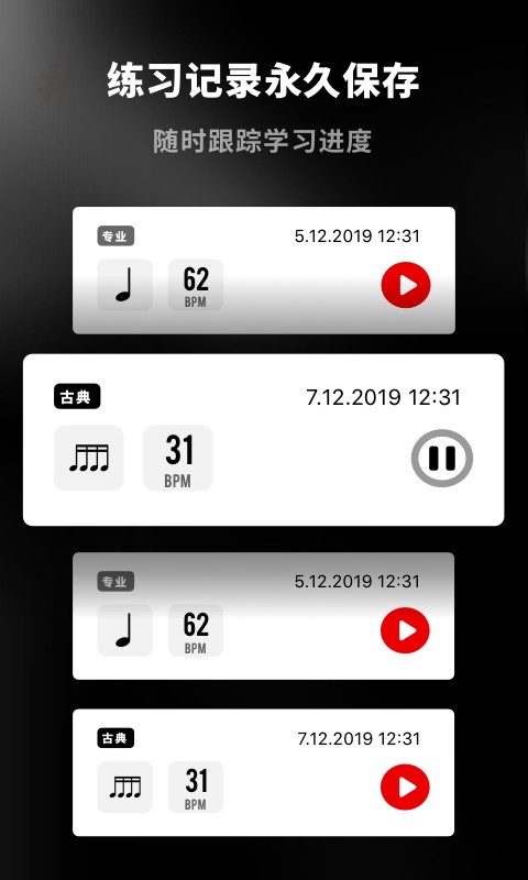 节拍器的播放历史长期保存,可以随时查看自己上一次的练习进度