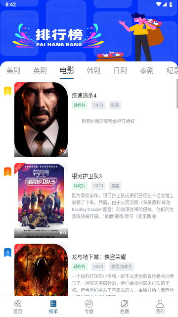 2、电影推荐:在这里能够观看到到不同的电影推荐,通过排行榜进行了解。