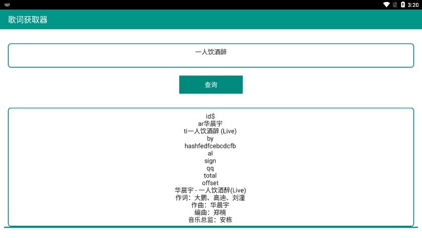 2、输入Id号后显示歌词的同时能够显示歌曲名和歌手信息。