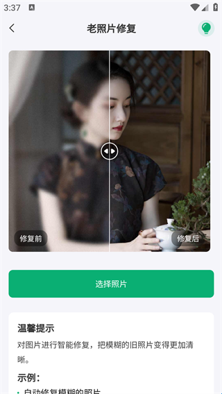 1、采用先进的智能修复技术,能够智能识别照片中的各种损伤,并自动进行修复,极大地简化了修复流程;
