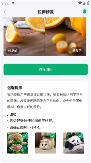 6、点击拉伸修复,该功能适用于修复被过度拉伸,或者长款比例不正常的图像,AI智能还原图像为正常比例,避免使用图像模糊、像素过低的照片;