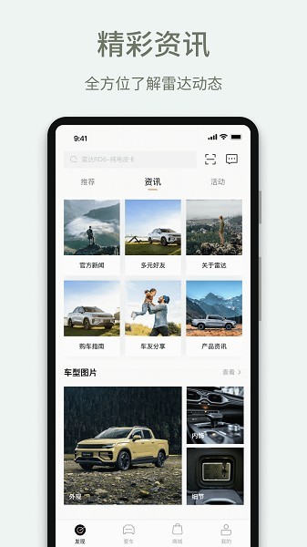 2、资讯,全面了解雷达新能源汽车动态及车主用车体验,获取实用的用车、购车指南