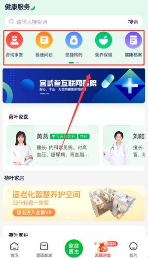 4、家庭医生板块整合了家医咨询、快速问诊、便捷购药及营养保健等多项服务。