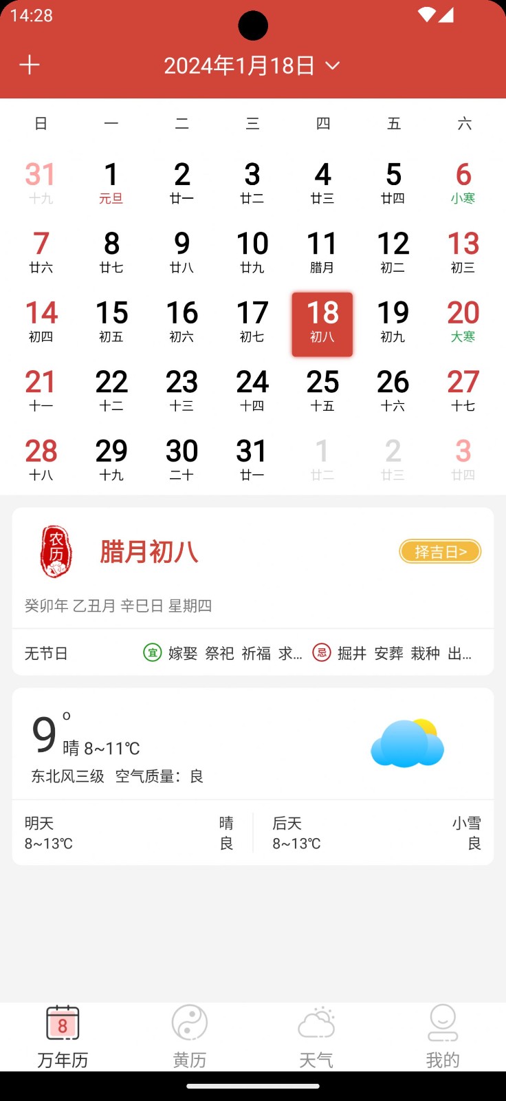 4、使用方便:操作简单直观,用户只需要轻轻一点,即可快速获取所需的日期、天气和黄历信息。