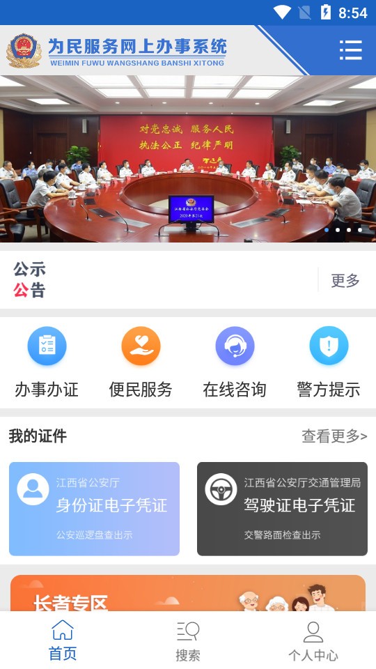 江西公安app是江西省公安厅基于“互联网+公安”研发打造的一款掌上政务服务平台,集行政审批、办理证照、便民服务、警务资讯四大功能于一体,内置所有业务办理的ru口,包含全省各级公安机关的政务服务事项,以及网上办和窗口办的事项等等20项各类便民服务,群众可以查看办事指南、预约、申报办理各项业务,查询办件进度、重名、驾驶证、机动车违法等信息,逐渐做到“马上办”、“网上办”、“就近办”、“一次办”等属性,正确接受群众监督,让政务处理公平化、公开化、透明化,实现规范化、高效率的服务。