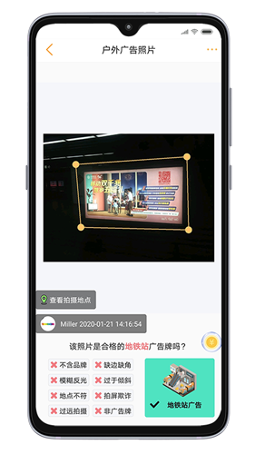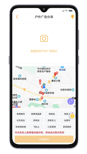 2、支持用户自行拍摄户外广告图片,并进行分享;