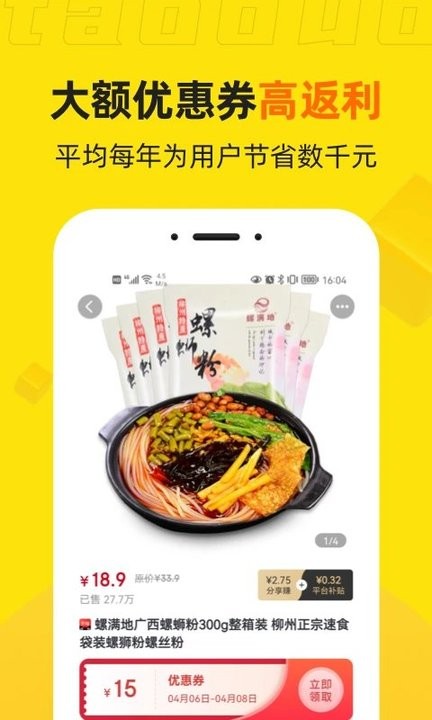 它是由苏州热猫网络传媒有限公司打造的一款专享优惠券秒杀软件,该平台针对国内千万网购爱好者的日常购物折扣优惠券领取需求,汇聚淘宝、天猫活动商城全部商品的海量折扣优惠券,每天更新活动商品50000+,覆盖服装、母婴、化妆品、居家、鞋包配饰、美食、车体文品、数码家电等,全网商品一网打尽,而且还支持商品限时限量,超多场底价抢购活动,让用户在购物的同时省钱2%-80%,淘宝京东有返还,不知不觉省下生活中网购花销。