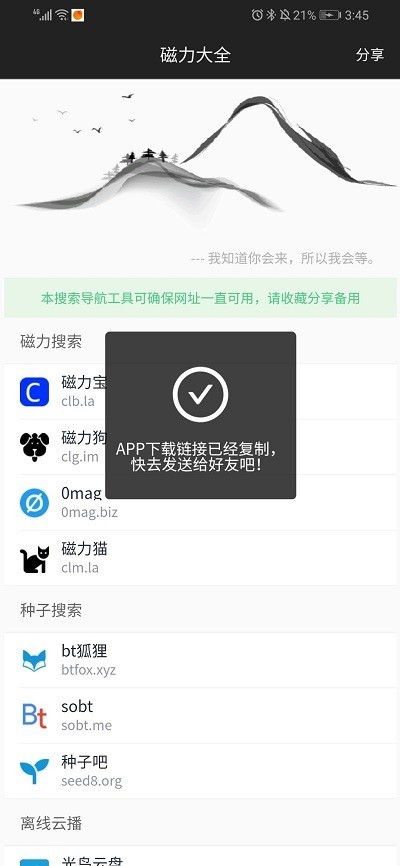 磁力大全app专为广大小伙伴们提供海量磁力资源可以自由下载,用户们可以自行搜索想要的内容,所适用的场景也是非常丰富的,音乐、图书、图片、综艺、软件、动漫、以及各种学习资料都是非常齐全的,所有内容都是完全免费的,下载不限速,有需要的小伙伴们快来下载试试吧!