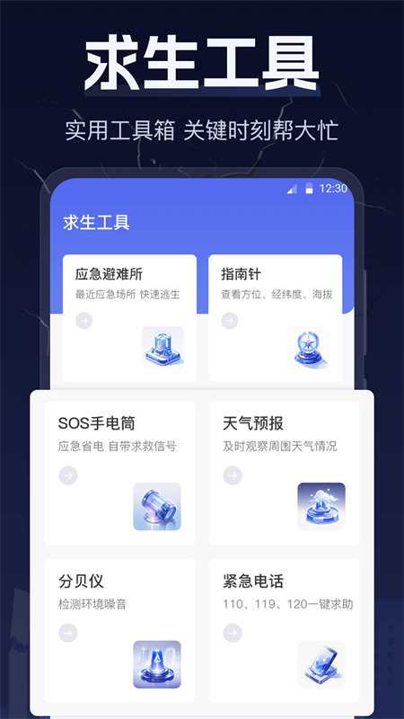 3、实用生存工具集合:内置指南针、SOS手电筒、天气查询、紧急电话及分贝仪等功能,确保用户在紧急状况下仍具备基础生活保障能力。