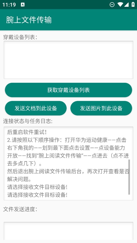 腕上文件传输软件是一款手表端文件传输app,该软件可以帮助广大手表用户们快速完成文件传输操作,连接相关设备、发送图片或者文件即可完成,传输速度也是非常快的,省时省力,该软件是完全免费的,操作简单,有需要的小伙伴们快来下载试试吧!