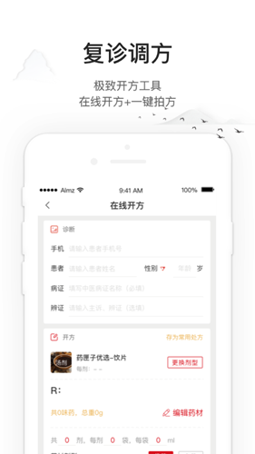 1、我的患者:管理新老患者,历史处方一键重开,线上调药复诊轻松解决,增强患者求医时效性,提升中医师口碑。