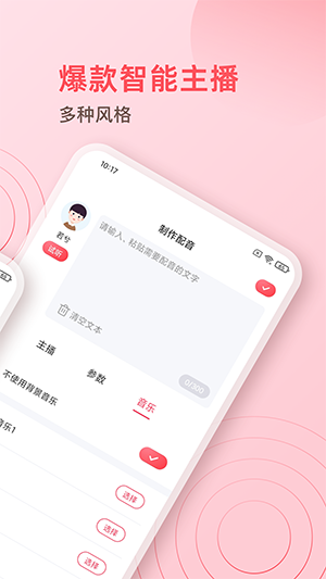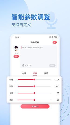超级配音师是一款可以自己配音的app,该软件内所提供的服务板块是非常齐全的,提供海量配音模板,用户们可以根据个人需求进行调整,语速、语调、人声、音乐等,支持自定义文本内容,自由创作能力是非常高的,操作简单,感兴趣的用户朋友们快来下载吧!
