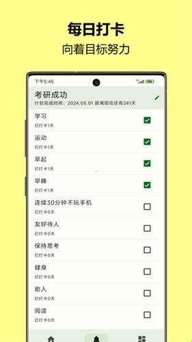 通过每日打卡来跟踪你的目标和进度。这个简单而强大的功能将激励你坚持下去,并建立稳定的自律性。