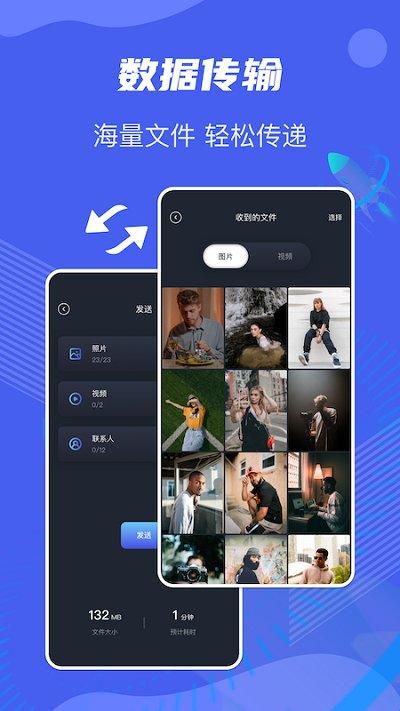 是一款无需登陆完全免费无广告的安卓文件传输神器软件。生活中大家难免会遇到需要互传大量文件的时候,就是无限流量也烧不起啊!比如旧手机换新手机,手机之间互传文件怎么操作呢?最快的方法就是下载安装这款手机克隆互传同步换机助手软件,不消耗流量,不用数据线,不同手机间轻松隔空传资料