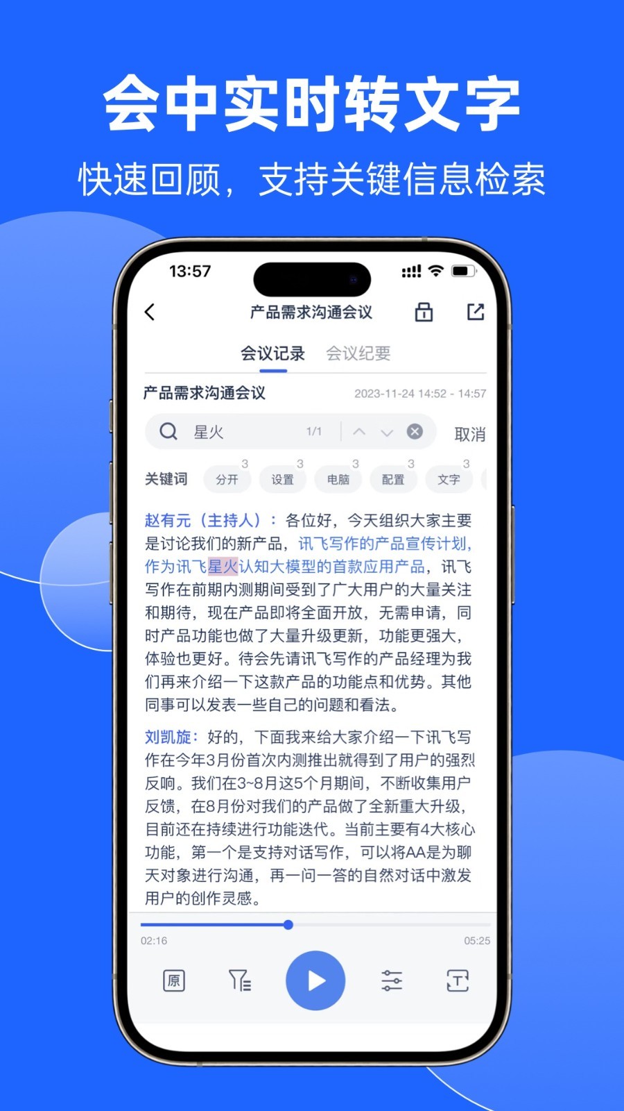 讯飞听见会议是一款由安徽听见科技有限公司所打造的掌上视频会议工具,该软件所适用的场景是非常丰富的,以及所提供的功能是非常齐全的,可以高效的记录下每一次沟通,该软件实用性是非常高的,省时省力,最大化提高办事效率,有需要的小伙伴们快来下载试试吧!