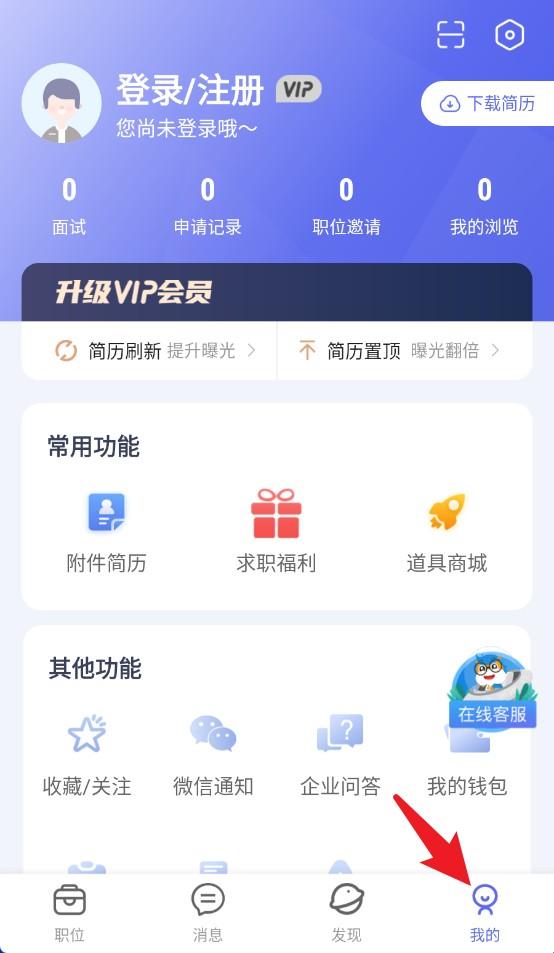 5、用户中心内还可升级VIP、刷新简历、开通道具商城等功能,提高求职竞争力。