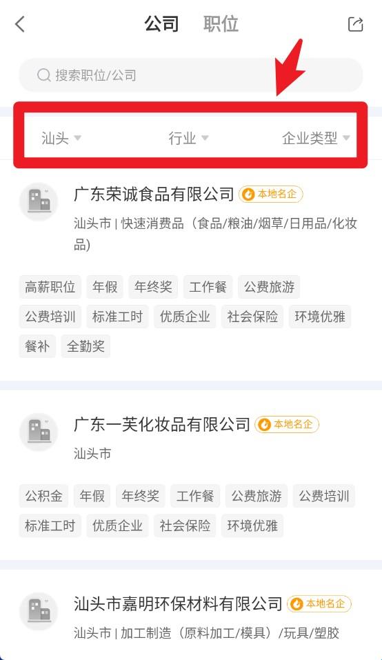 3、公司页可按地区、行业、企业类型等条件筛选,便于定位心仪公司和企业环境。