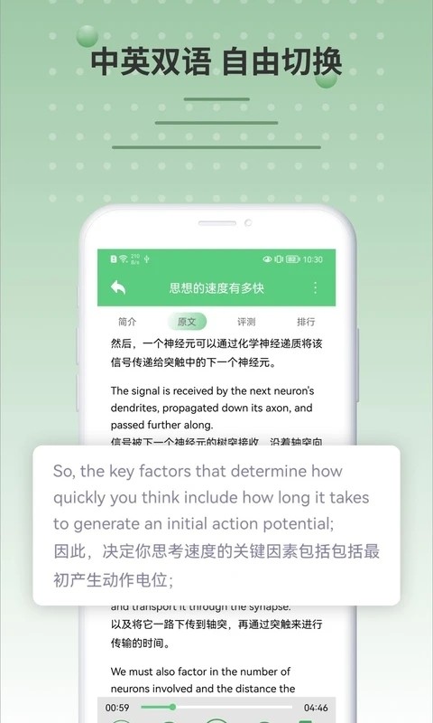 4、内容针对不同英语程度的学习者提供全英文和中英文对照两种模式,并可以随意切换。