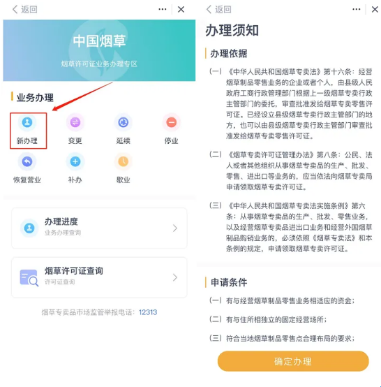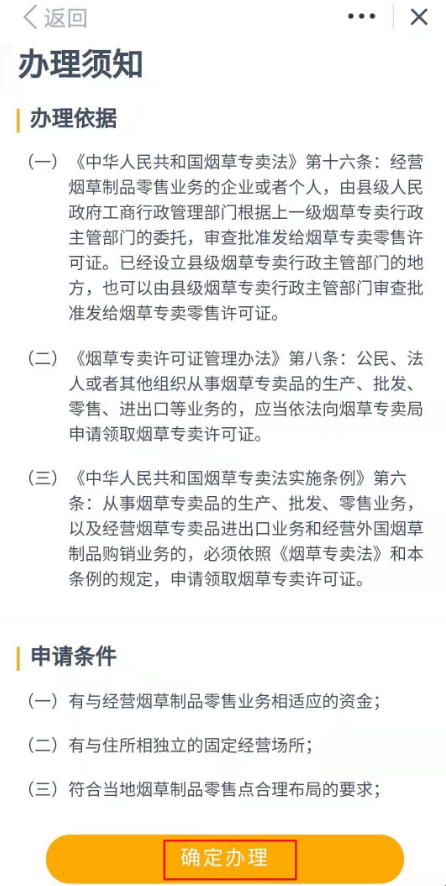 2、点击所需办理的事项,点击手机下方“确定办理”,输入烟草专卖零售许可证号然后点击“下一步”。