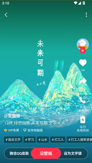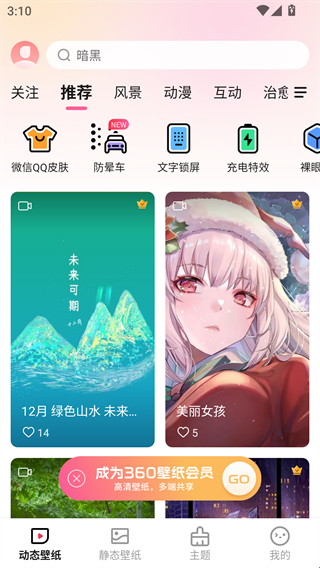 2、首页可以看到推荐的很多壁纸资源,下方还有微信QQ皮肤、文字锁屏等不同分类。