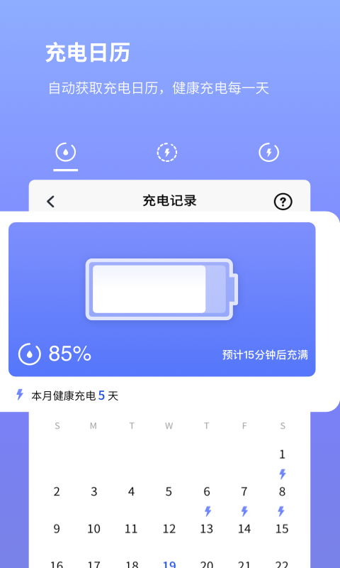 充电日历:充电日历自动获取充电次数,为您记录每一次充电,帮助查看充电频率,了解电池续航时长。