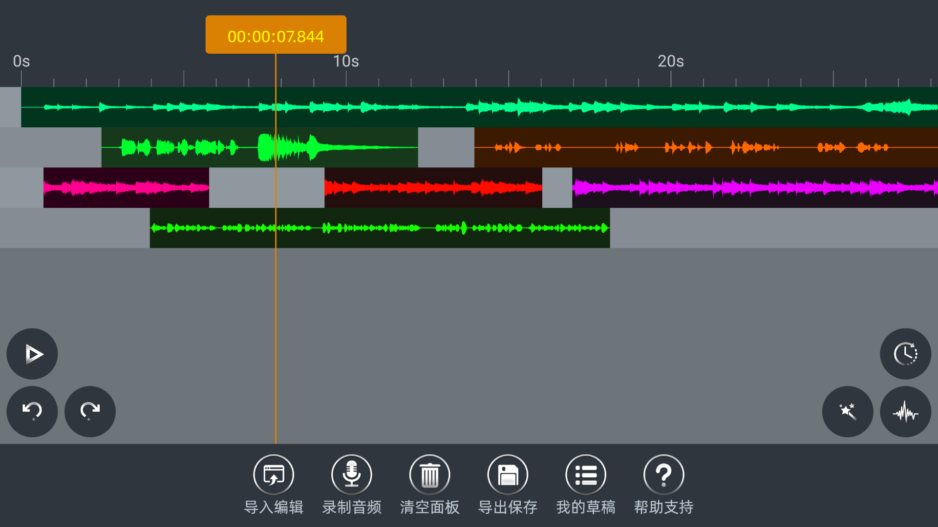 发展了多年的多轨音频编辑器,素材录制、项目管理、剪辑制作、效果运用、混音处理、编码发布等一系列过程,就像在电脑上操作似的。包括但不限于下列能力,如分割、复制、拼接、边听边录、升降调、变速、调音量、均衡(EQ)、平衡(Pan)、语音降噪、回响(Echo)、设置左右通道、渐入渐出、从视频提取音频、文本转语音、分离伴奏和人声等等。支持几乎所有的流行音频文件格式,并支持保存导出mp3、m4a、aac、wav、flac、amr、wma等常用音频格式。同时,我们提供视频教程和在线客服为您解决难题。